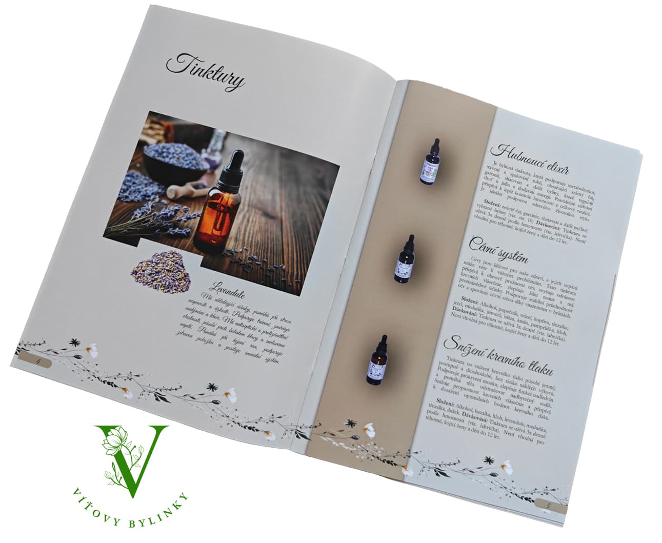 Postupně jsem vytvořil grafický styl, layout, typografii i doprovodné vizuální prvky. Katalog zahrnuje popisy bylinek, infografiky, sezónní nabídky i praktický recept. Vše je sladěno do jednotného vizuálu, který má nejen estetickou, ale i praktickou hodnotu.